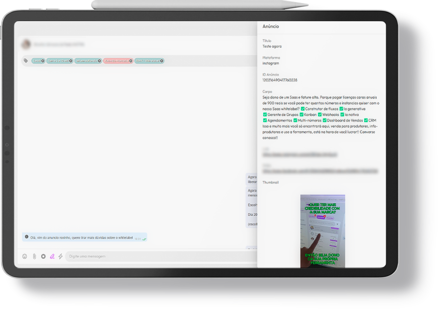 Inovamos mais uma vez e agora permitimos que você rastreie seus anúncios direto no WhatsApp. Capture o ID e link do anúncio, thumbnail, título e o texto utilizado para converter aquele lead. Somos uma plataforma pioneira em inovações tecnológicas